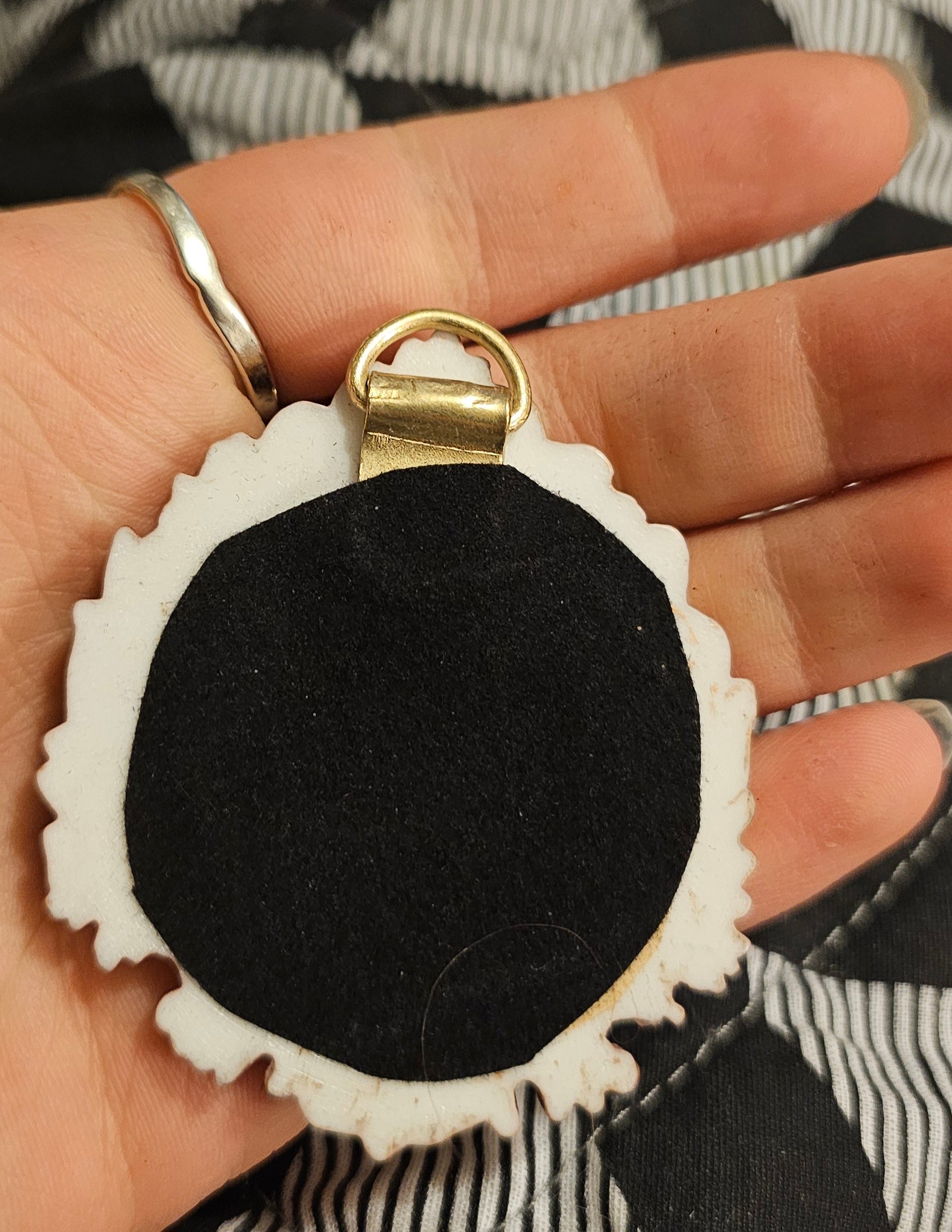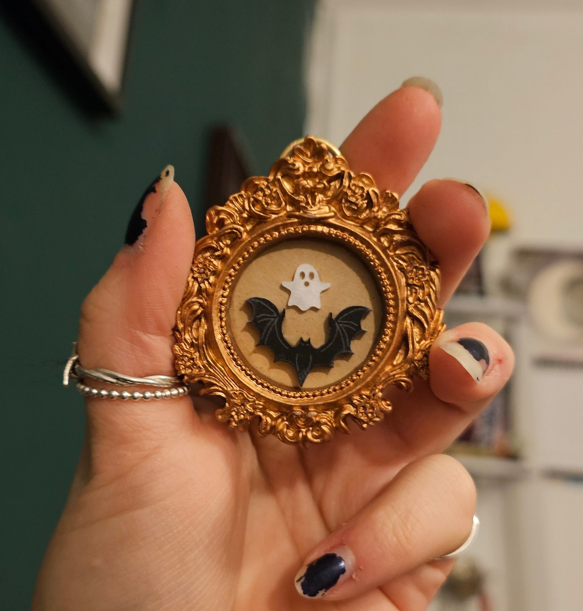 Round gold coloured frame with acrylic bat and ghost